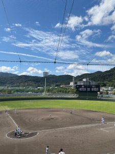 夏の甲子園を盛り上げた高校の試合が間近で見れることもあり、とても楽しみにしていました。 会場はマイネットスタジアム皇子山で両翼100m、センター122mでとても広い球場です。