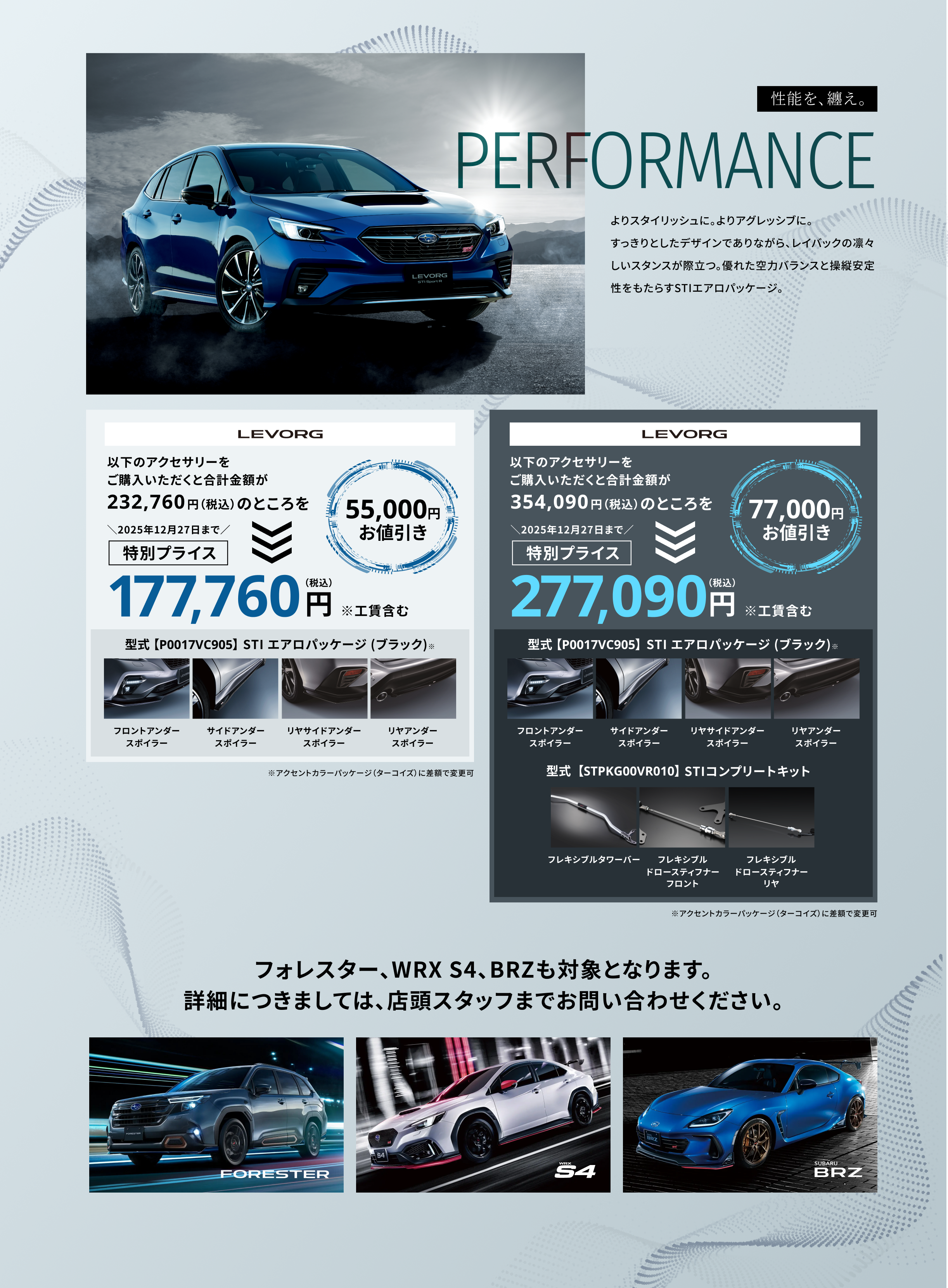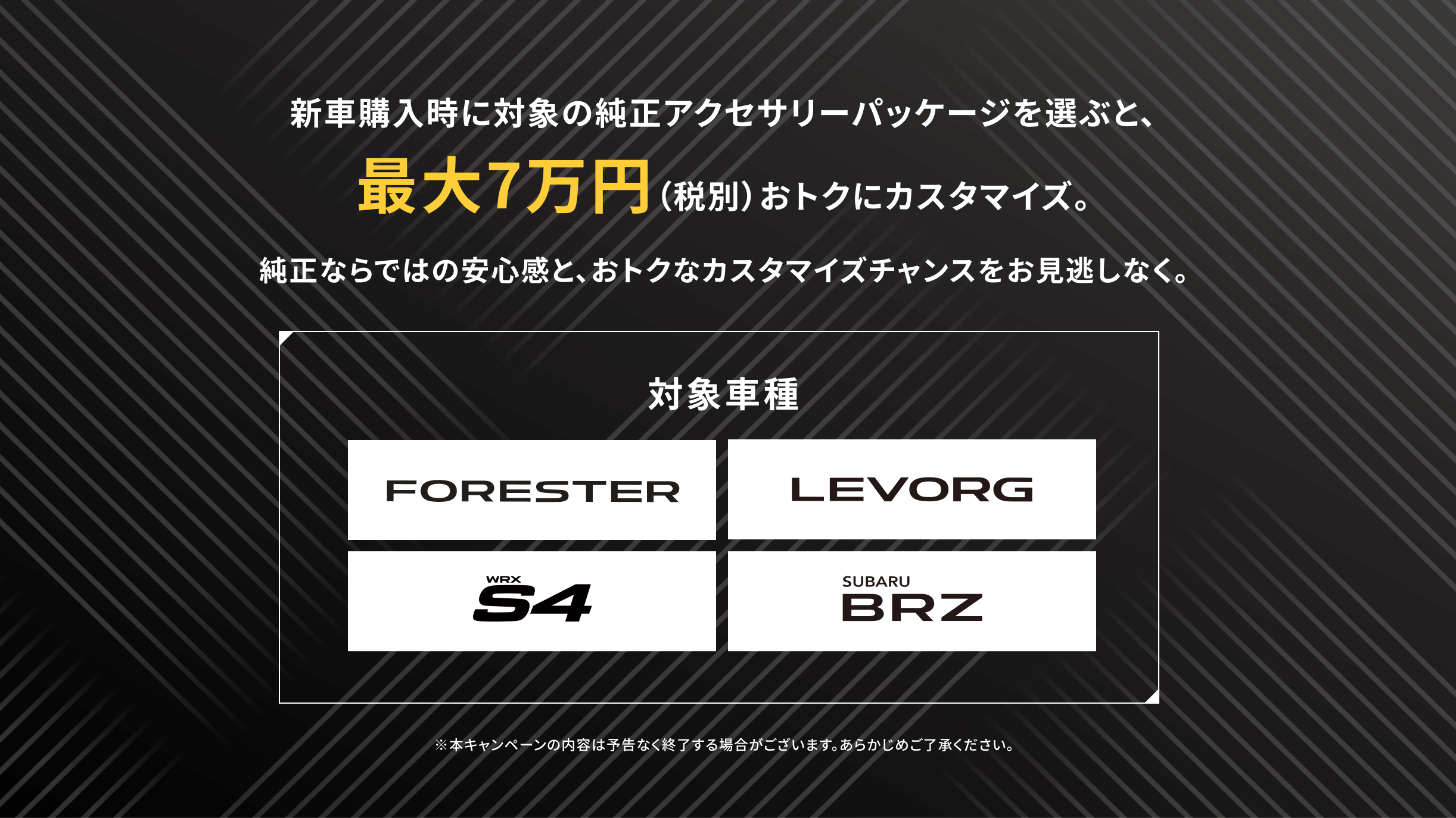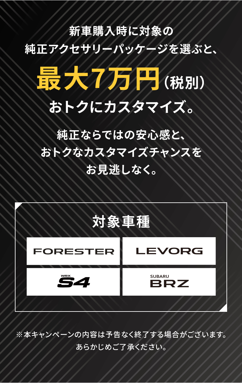 ※画像はイメージです。※既にご成約の車両にさかのぼっての適用はできません。※他のキャンペーンやクーポンとの併用はできません。※株式会社SUBARU販売店関係者は適用対象外です。※本権利は譲渡及び金銭や他の物品と交換はできません。※写真はすべてイメージです。※詳しくは店頭スタッフへお問い合わせください。