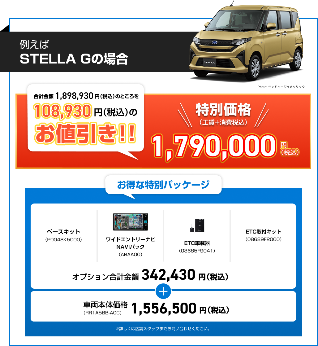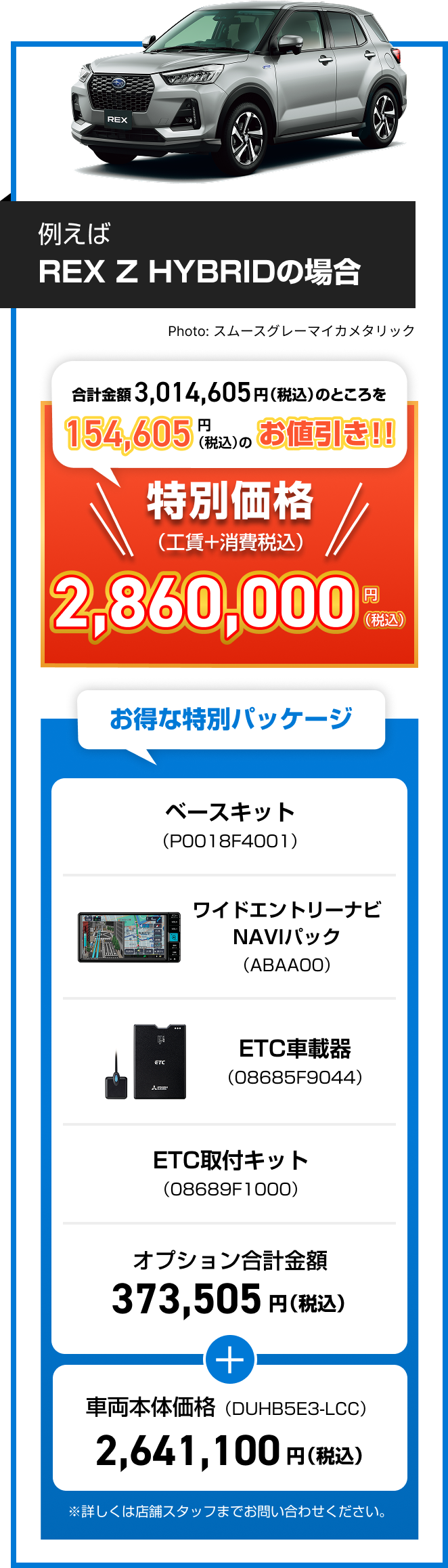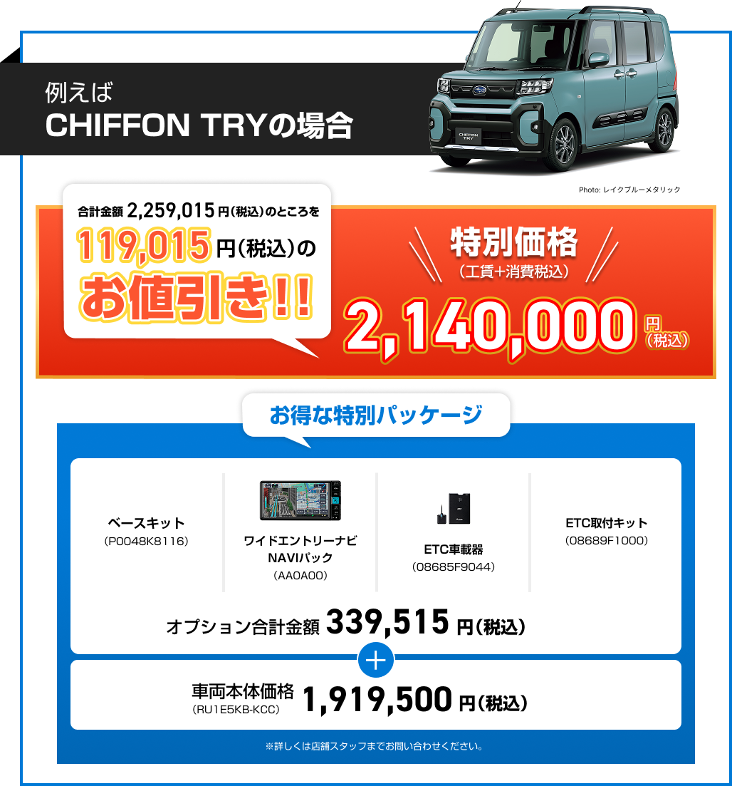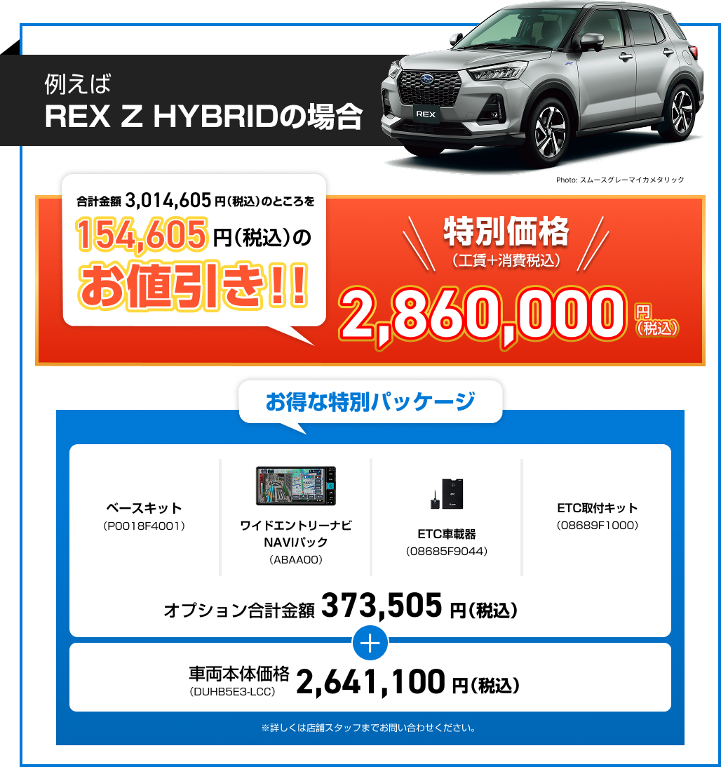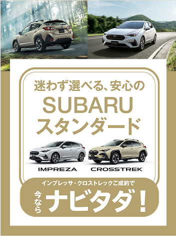 ※画像はイメージです。※既にご成約の車両にさかのぼっての適用はできません。※他のキャンペーンやクーポンとの併用はできません。※株式会社SUBARU販売店関係者は適用対象外です。※本権利は譲渡及び金銭や他の物品と交換はできません。※税金(消費税を除く)、保険料、リサイクル料金、登録に伴う諸費用等は別途申し受けます。※登録等に伴う手続き代行費用については別途消費税を申し受けます。※別途ETCセットアップ料金が必要です。※写真はすべてイメージです。※詳しくは店頭スタッフへお問い合わせください。