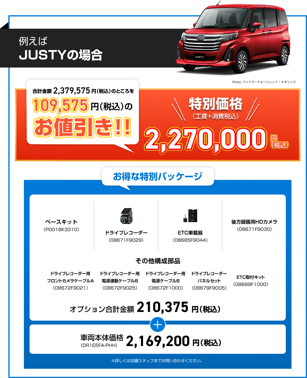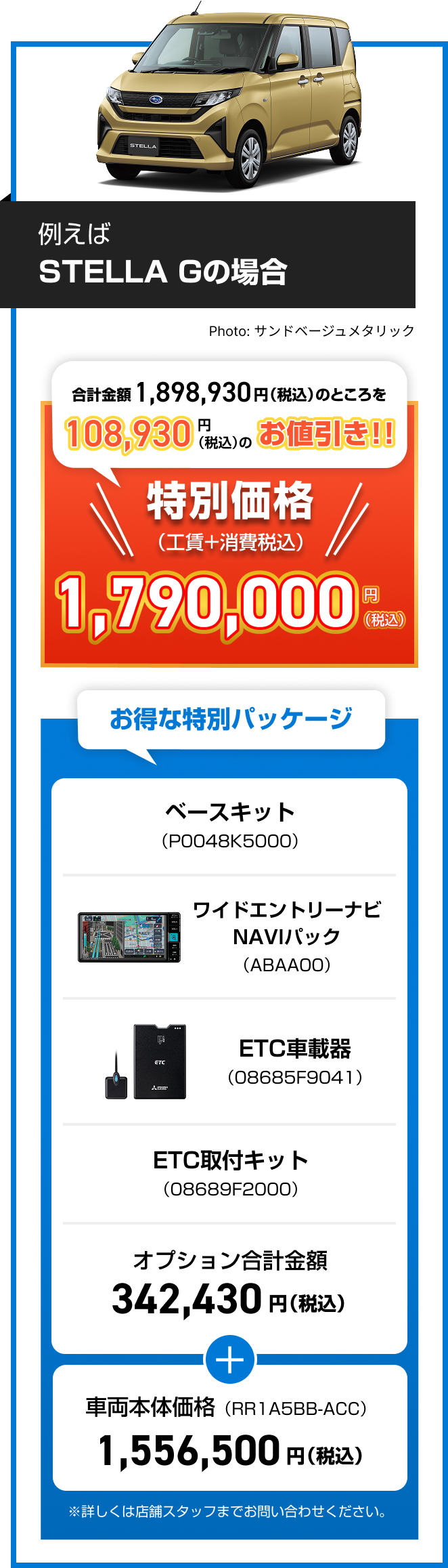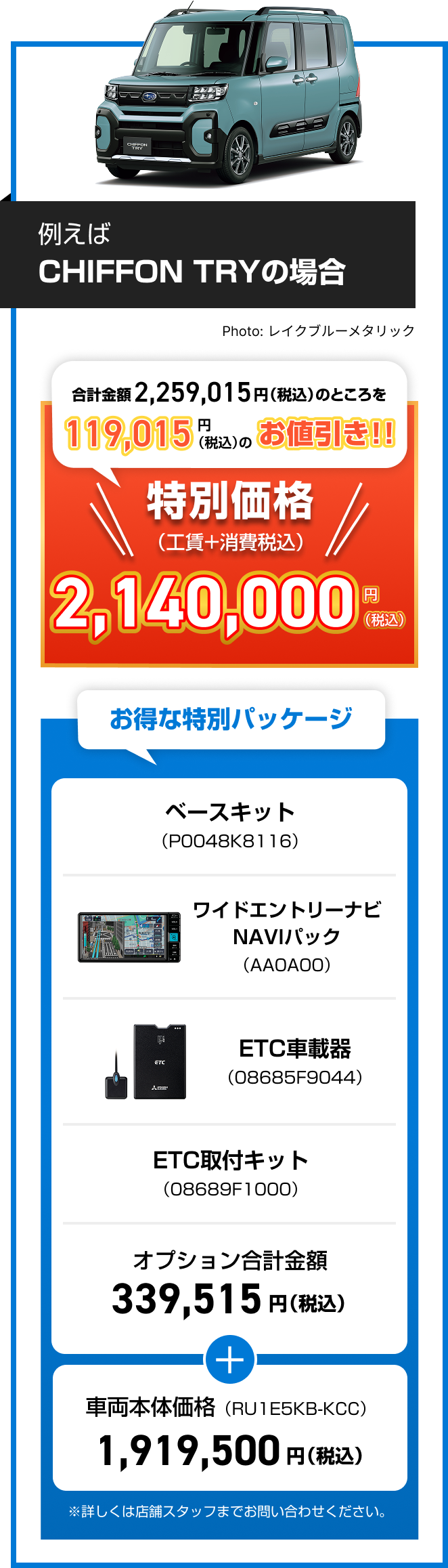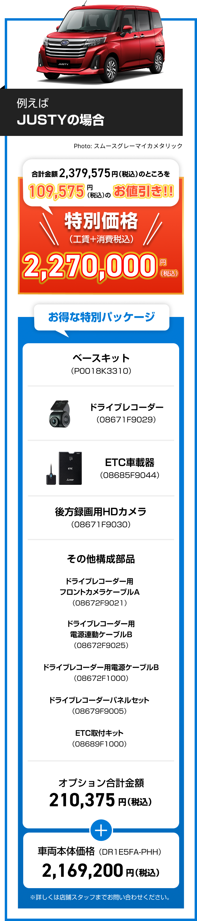 ※画像はイメージです。※既にご成約の車両にさかのぼっての適用はできません。※他のキャンペーンやクーポンとの併用はできません。※株式会社SUBARU販売店関係者は適用対象外です。※本権利は譲渡及び金銭や他の物品と交換はできません。※税金(消費税を除く)、保険料、リサイクル料金、登録に伴う諸費用等は別途申し受けます。※登録等に伴う手続き代行費用については別途消費税を申し受けます。※別途ETCセットアップ料金が必要です。※写真はすべてイメージです。※詳しくは店頭スタッフへお問い合わせください。